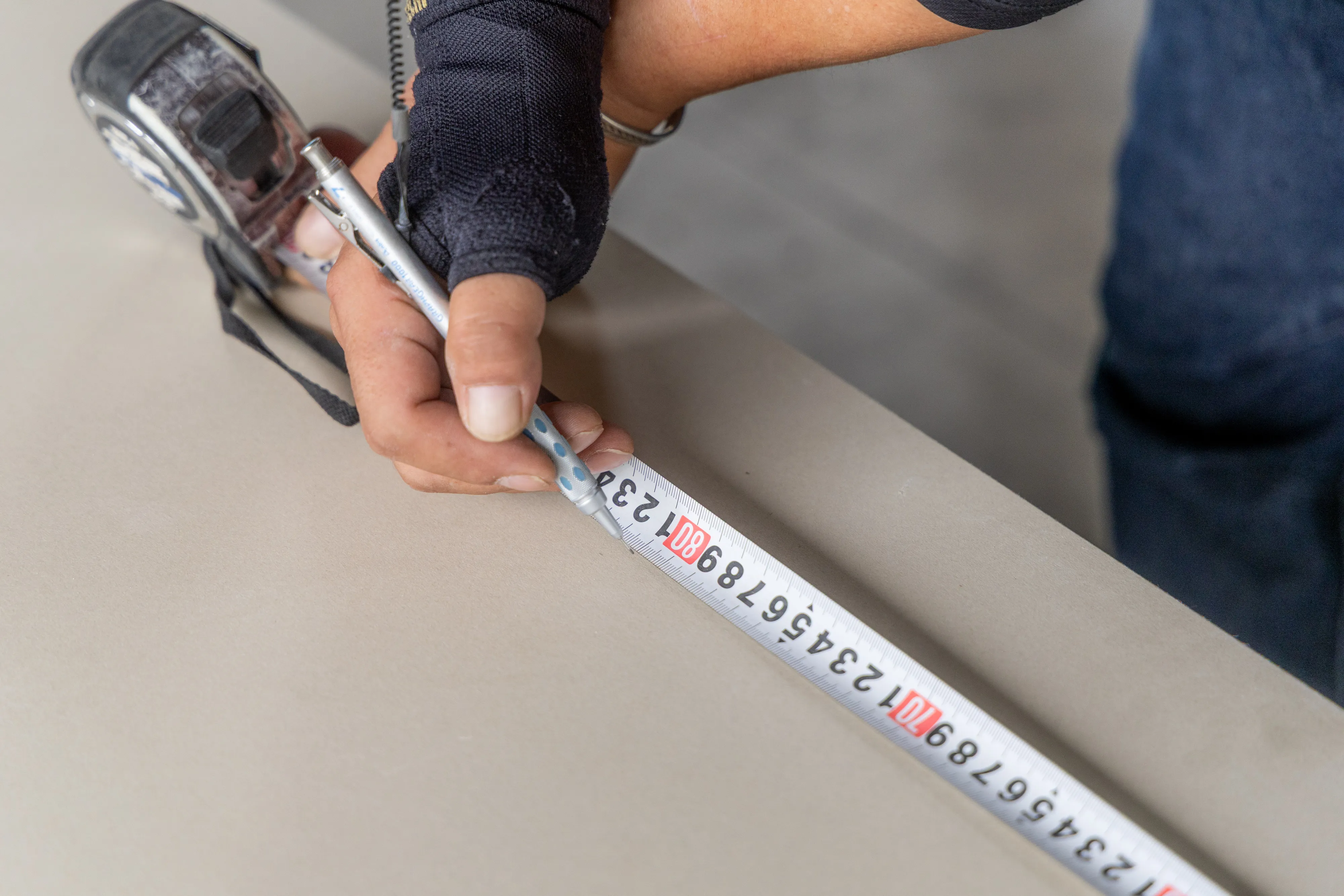 私たちは、このボード貼り工程において、極限の正確さを追求します。ボードはただ貼り付けるだけでなく、現場の寸法や開口部の形状に合わせて1枚ごとをミリ単位で正確にカットし、下地の骨組みに隙間なく強固に固定していきます。