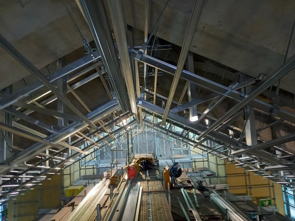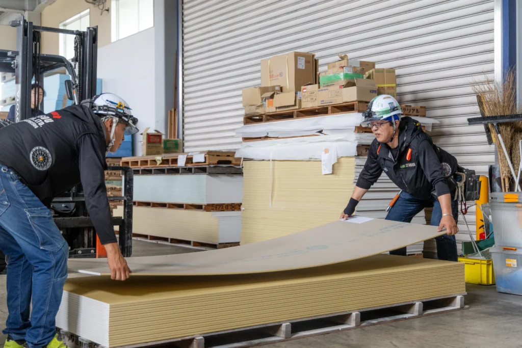 - 軽量鉄骨下地の組立やボード張りを中心に、建物の内装の“骨組み”から“仕上げ”まで行っています。現場によって内容は違いますが、完成時の達成感は毎回格別です!
